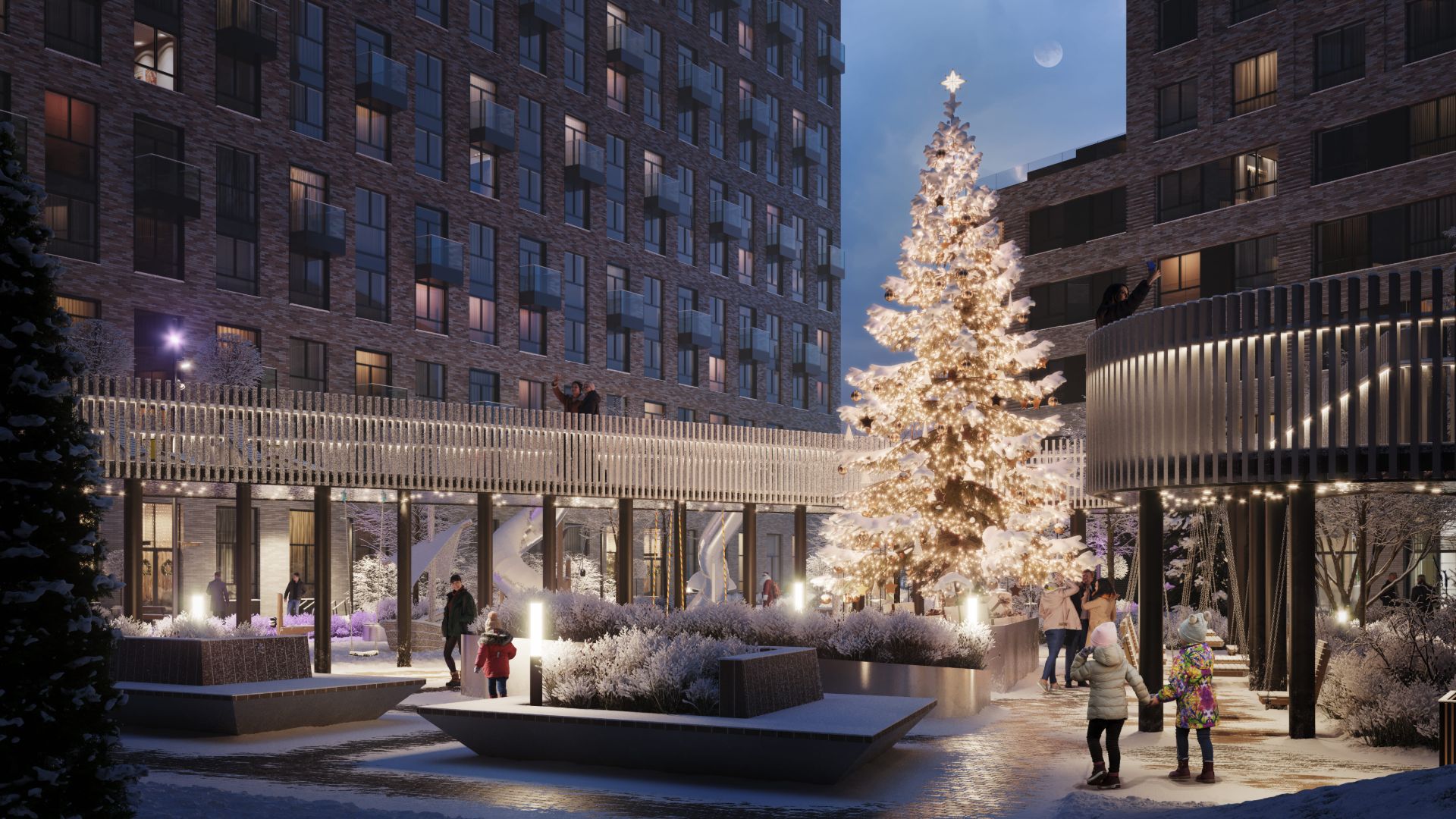 Во дворе предусмотрены пространства для жителей любого возраста: детские площадки, оборудование для воркаута, зоны для спокойного отдыха и большое количество зелени. Пешеходный мост делит территорию на автономные территории: амфитеатр, лаундж-зоны, игровые локации и места для работы на свежем воздухе.